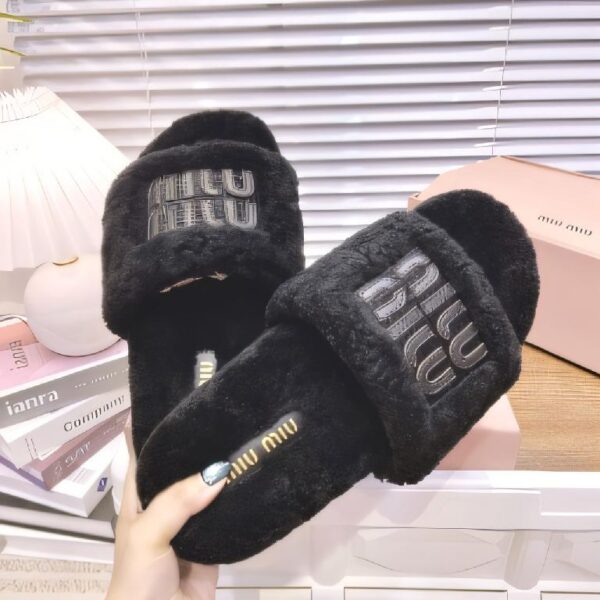 M家2024缪缪 秋冬新款字母羊毛拖鞋黑色