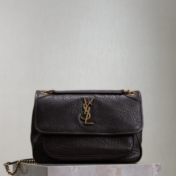 Saint Laurent Niki 深棕色裂纹皮革金扣链条单肩包 (大号)