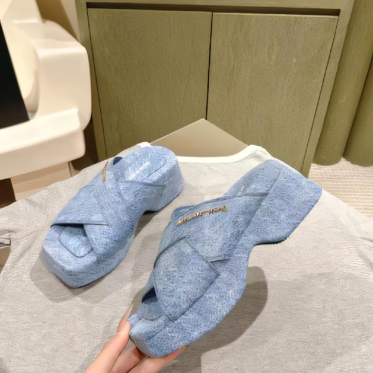 亚历山大・王(Alexander Wang)交叉带牛仔布厚底拖鞋(金属 Logo 款,牛仔蓝配色)(