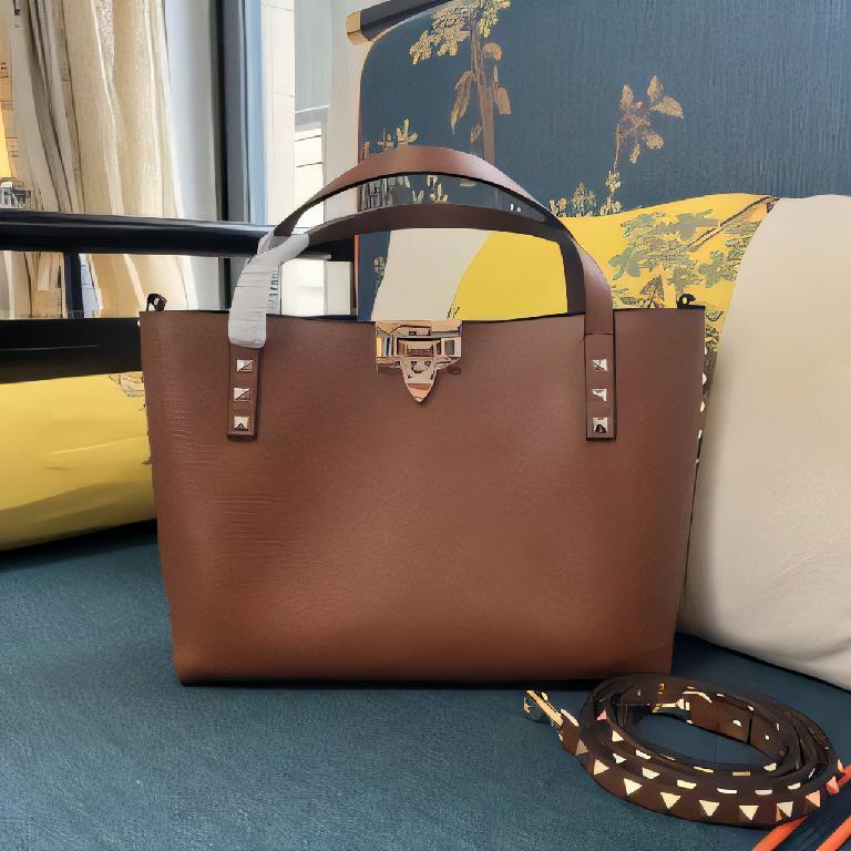 华伦天奴 Valentino Garavani Rockstud 粒面小牛皮托特包 棕色小号