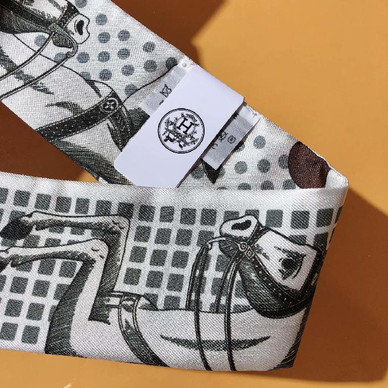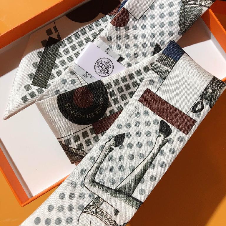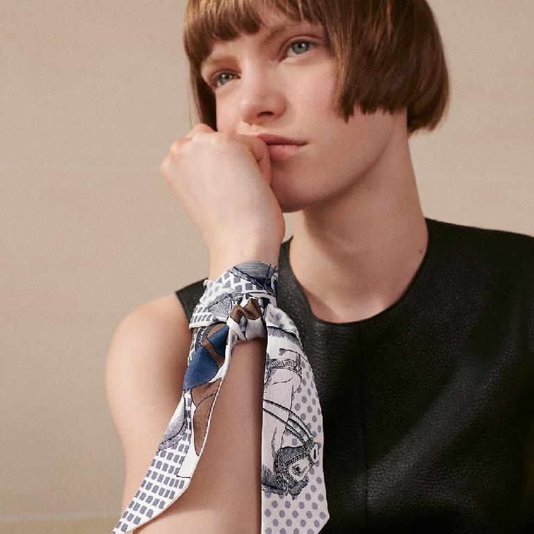 爱马仕【优雅骑士】Twilly小丝巾 灰色调搭配深蓝图形