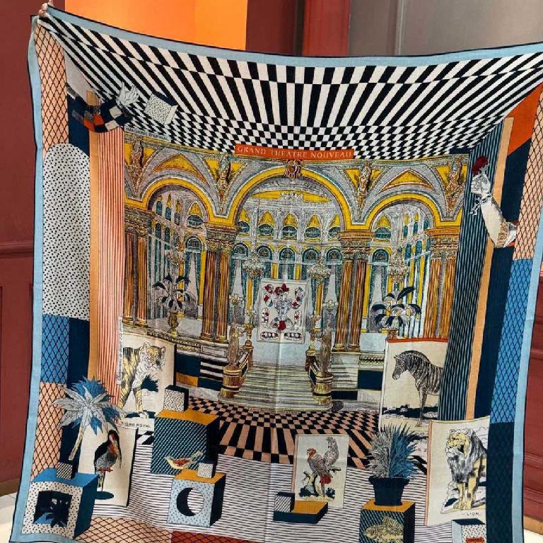爱马仕双面同色大剧院围巾 黑蓝黄多色撞色