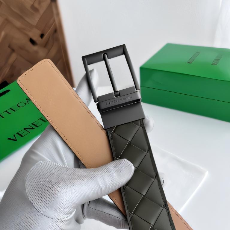 葆蝶家(Bottega Veneta)绿色绗缝小牛皮灰色板扣男士腰带