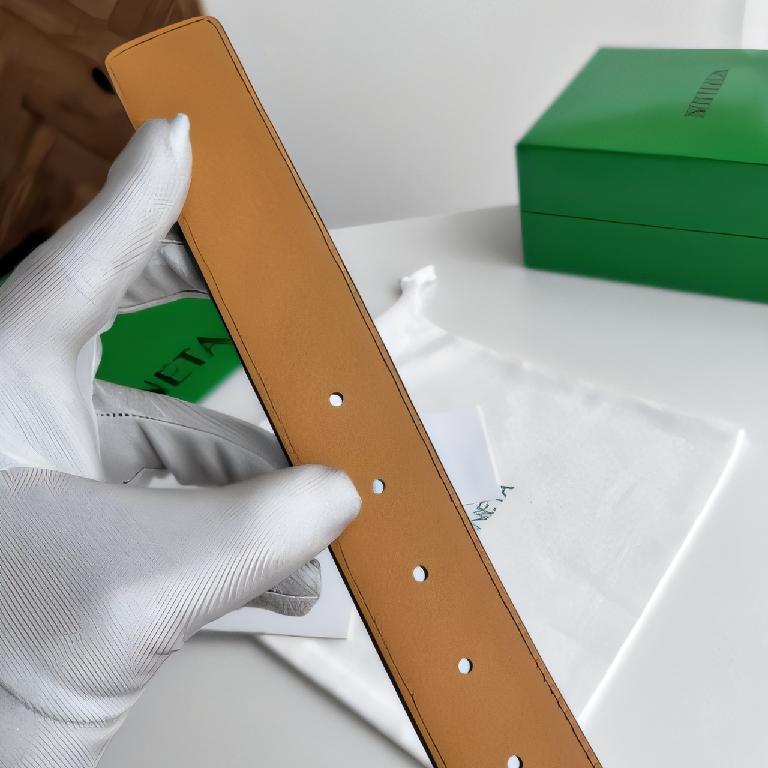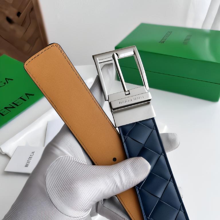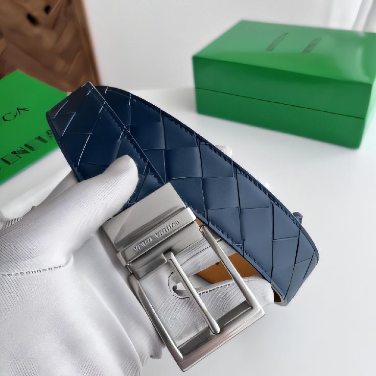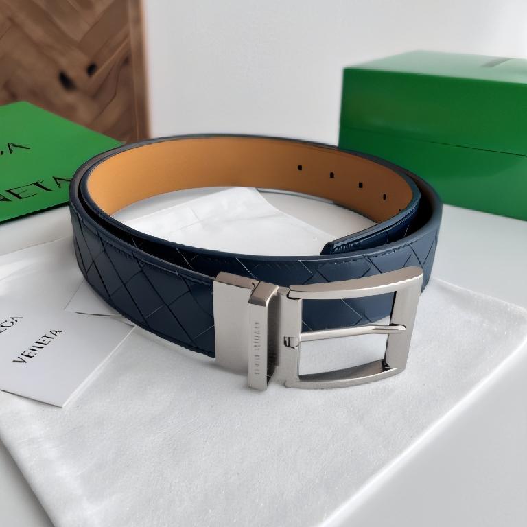 葆蝶家(Bottega Veneta)藏青蓝绗缝小牛皮银色板扣男士腰带