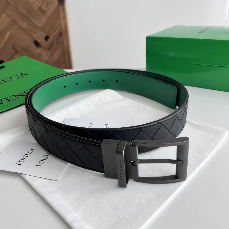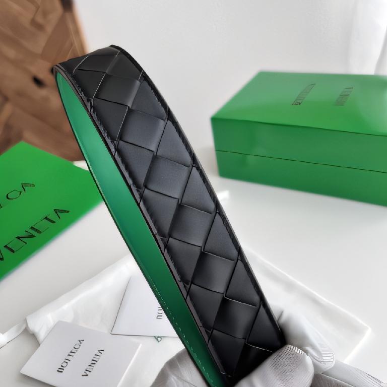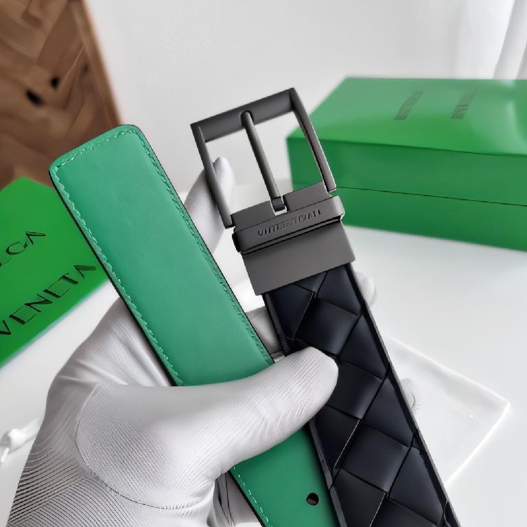 葆蝶家(Bottega Veneta)黑面艳绿底绗缝小牛皮银色板扣男士腰带