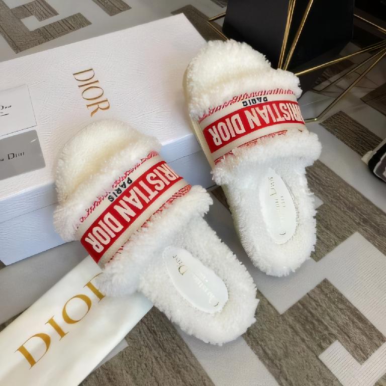迪奥(Dior)Oblique 标识装饰毛绒穆勒拖鞋(白红配色款)