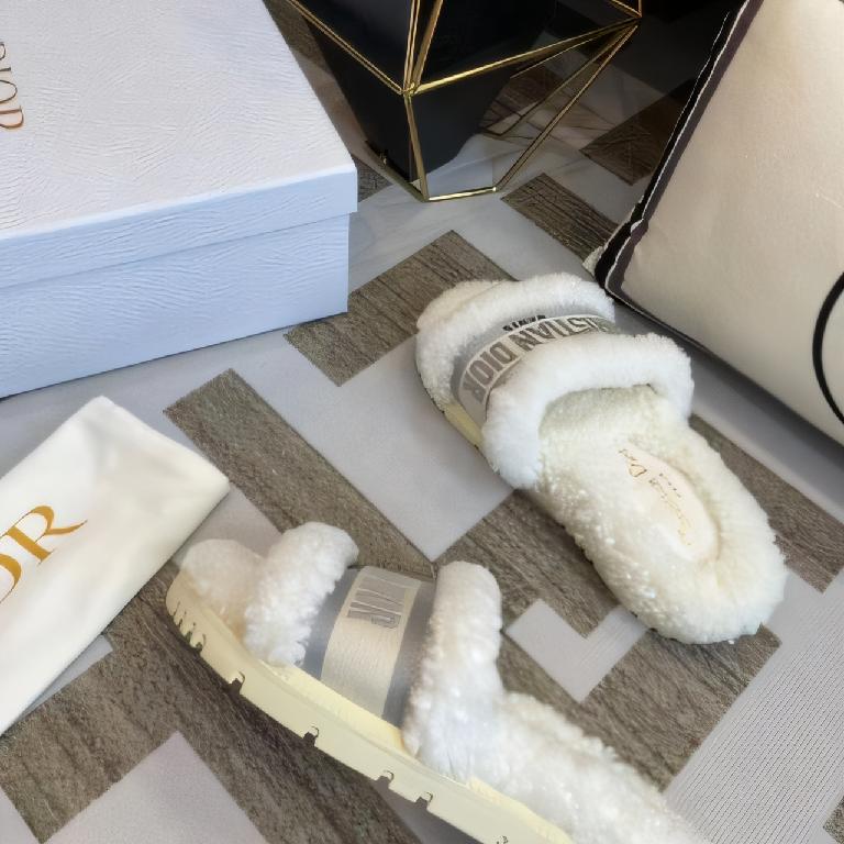 迪奥 Dior Christal Dior 系列毛绒穆勒拖鞋(白灰配色款)