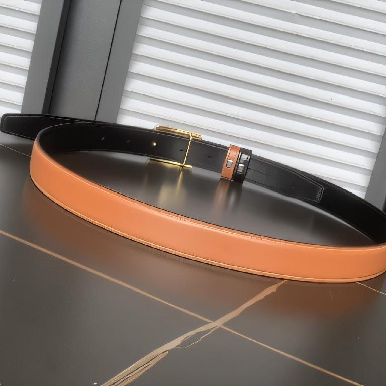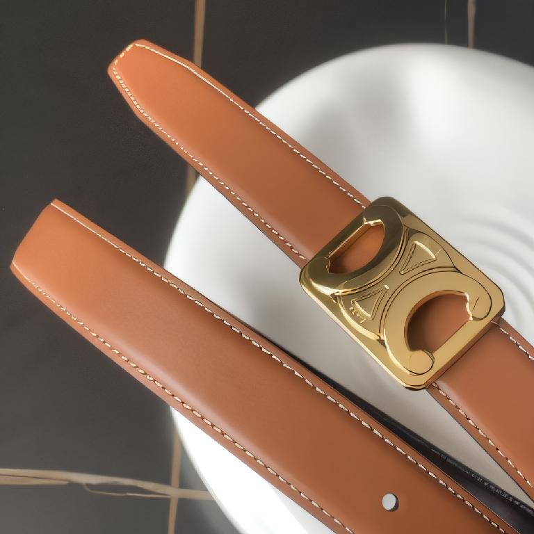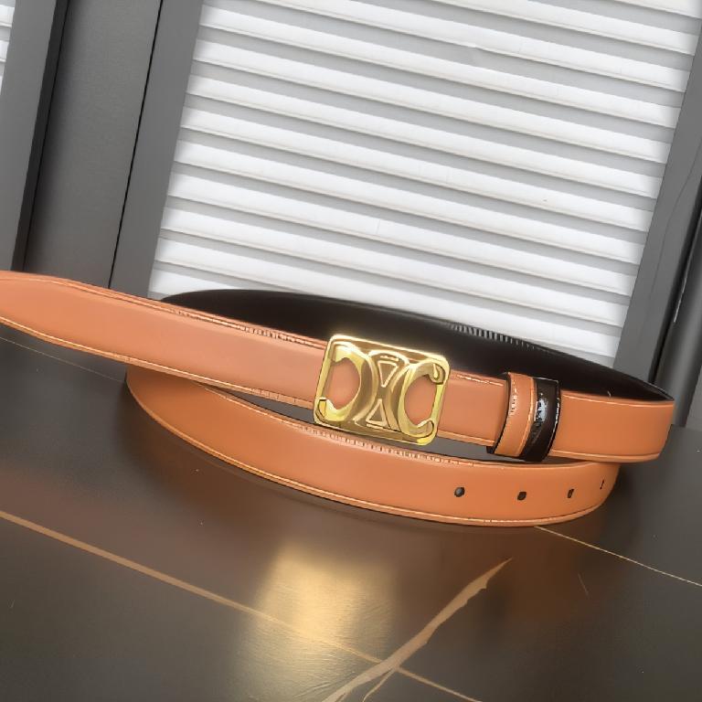 (Celine)橙色黑底小牛皮金色凯旋门扣双面女士腰带