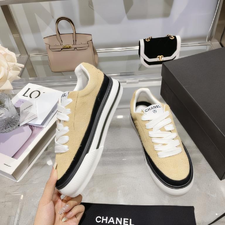 CHANEL 2023B 秋冬系列帆布皮革拼接厚底休闲板鞋(燕麦黄色)