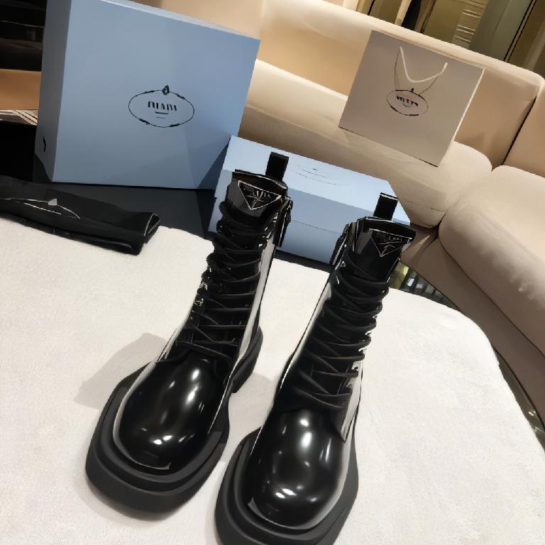 PRADA Monolith Suede Combat Boots 黑色亮皮厚底三角标侧拉链马丁靴