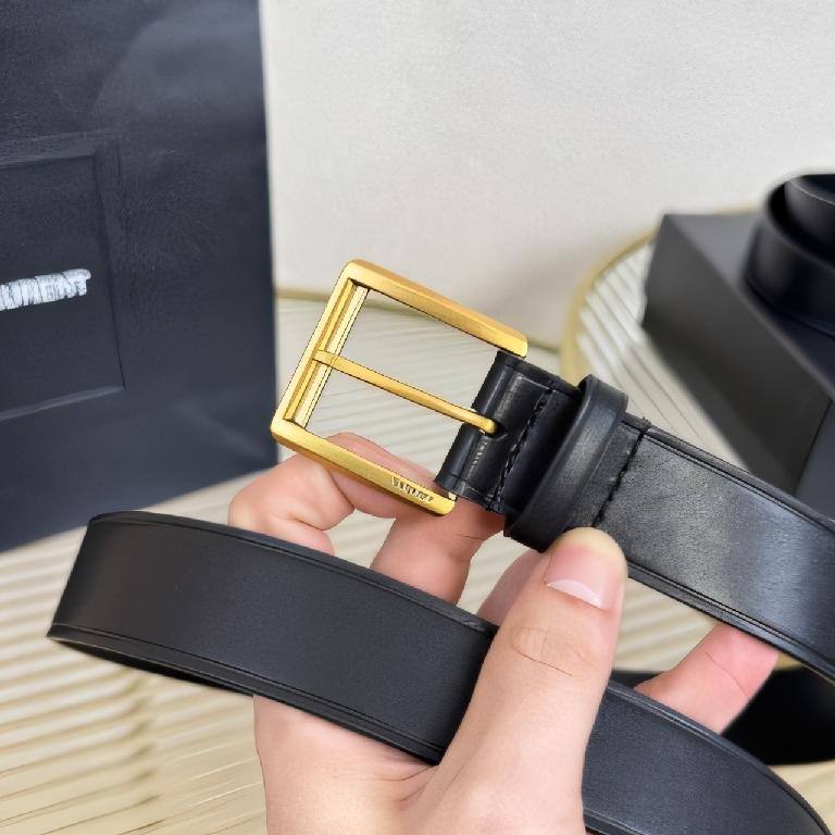 SAINT LAURENT(圣罗兰)黑色粒面皮革方形针扣腰带 (金扣)