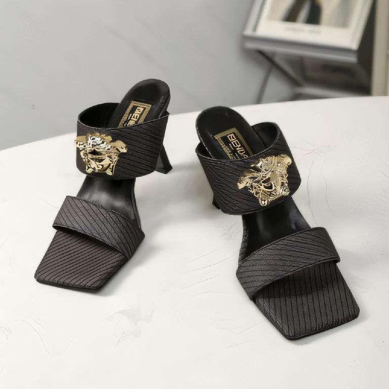 VERSACE Medusa Aevitas Mule Sandals 黑色蛇纹皮革美杜莎装饰高跟穆勒鞋