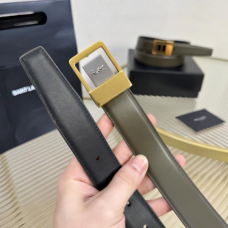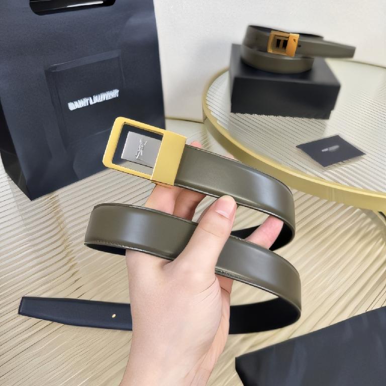 圣罗兰(Saint Laurent)YSL 标识系列橄榄绿色牛皮银色方形 YSL 扣腰带