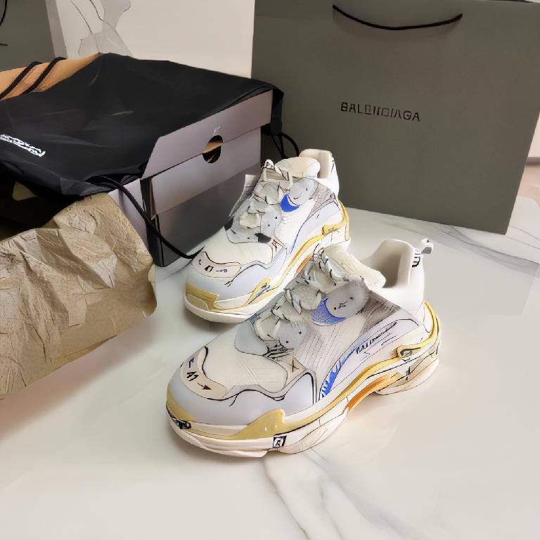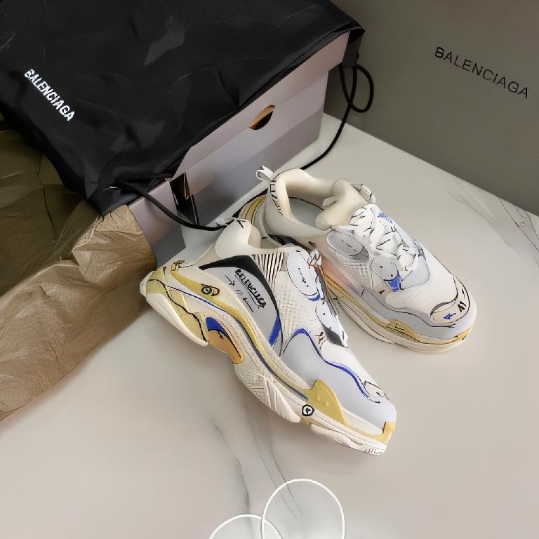 巴黎世家 Triple S 系列艺术印花厚底复古老爹鞋(白色基底款)