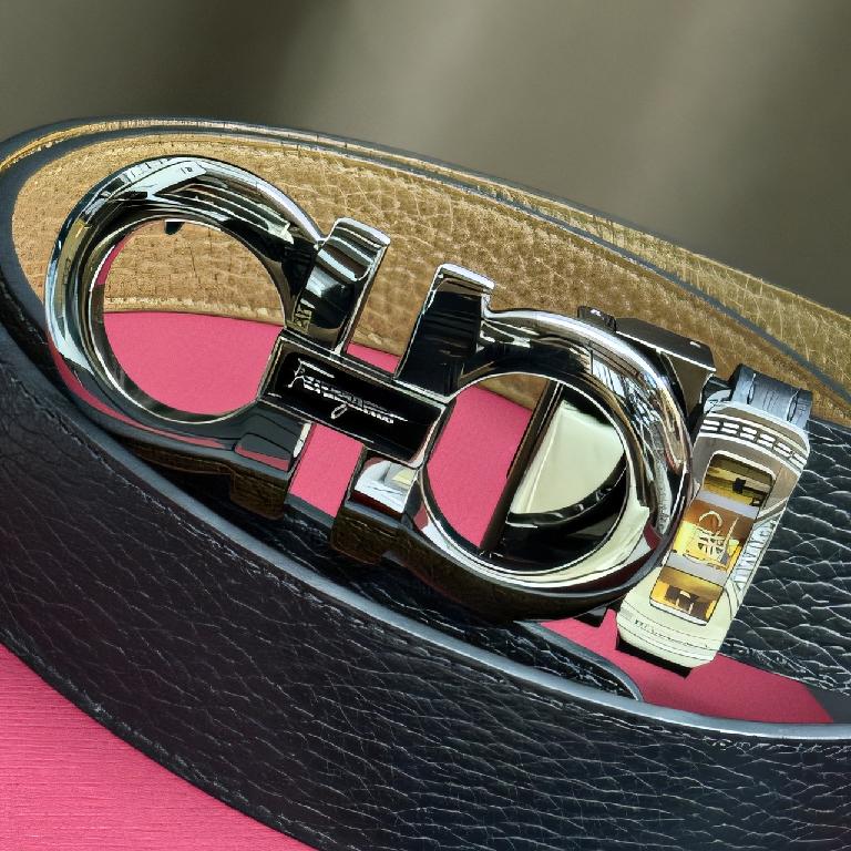 菲拉格慕(Salvatore Ferragamo)Gancini 系列黑面土黄色底双面荔枝纹皮革银色双 Gancini 扣腰带