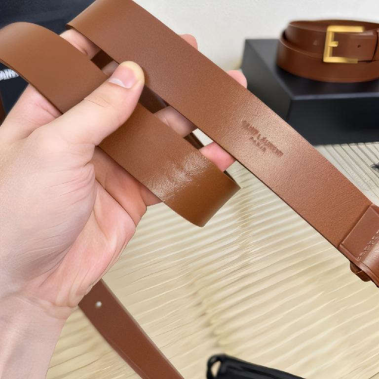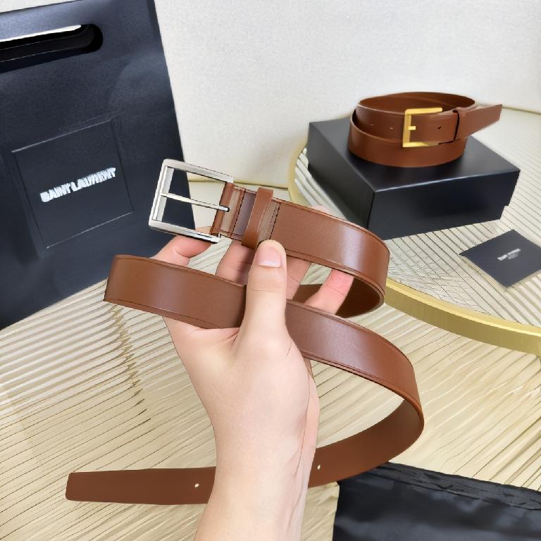 SAINT LAURENT(圣罗兰)褐色粒面皮革方形针扣腰带 (银扣)